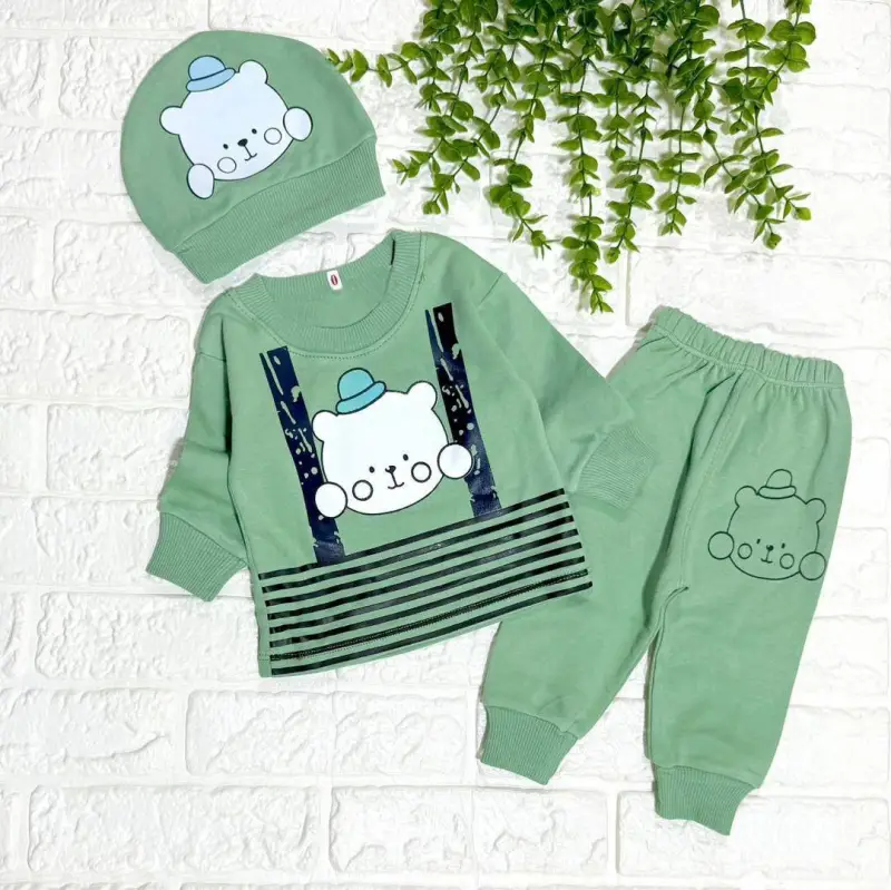 خرید عمده ست ۳ تکه نوزادی بلوز، شلوار و کلاه طرح خرس