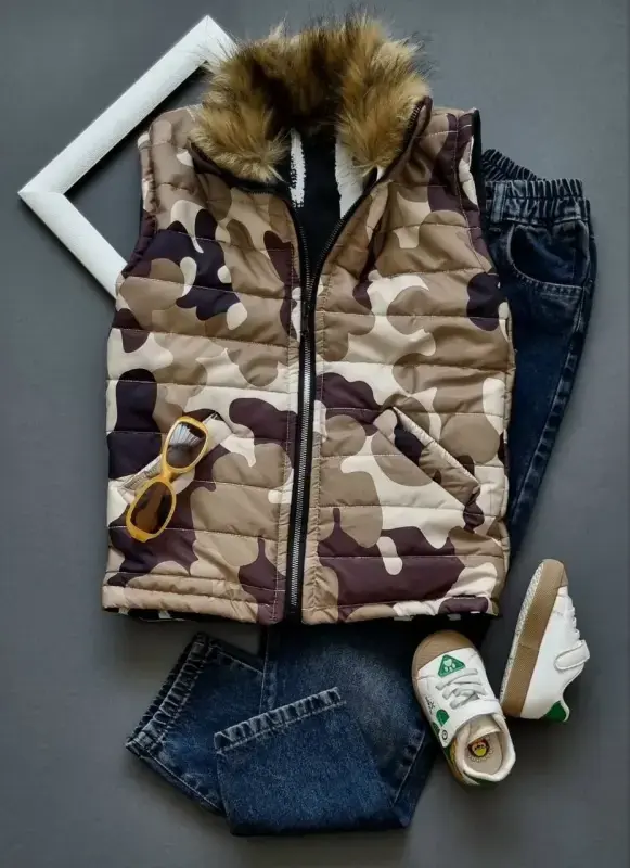 کاپشن پافر دورو یقه خزدار بچگانه طرح ارتشی
