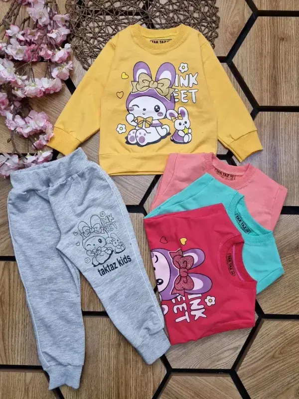 ارائه دهنده خرید عمده پوشاک بچه گانه، بلوز شلوار دخترانه با طرح جذاب خرگوش و شخصیتهای کارتونی. این محصول با کیفیت، انتخابی ایدهآل برای تکمیل موجودی فروشگاه شماست.
