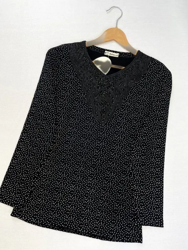 بلوز آستین بلند کبریتی زنانه طرح خالدار با یقه گیپور