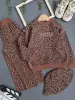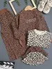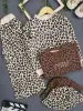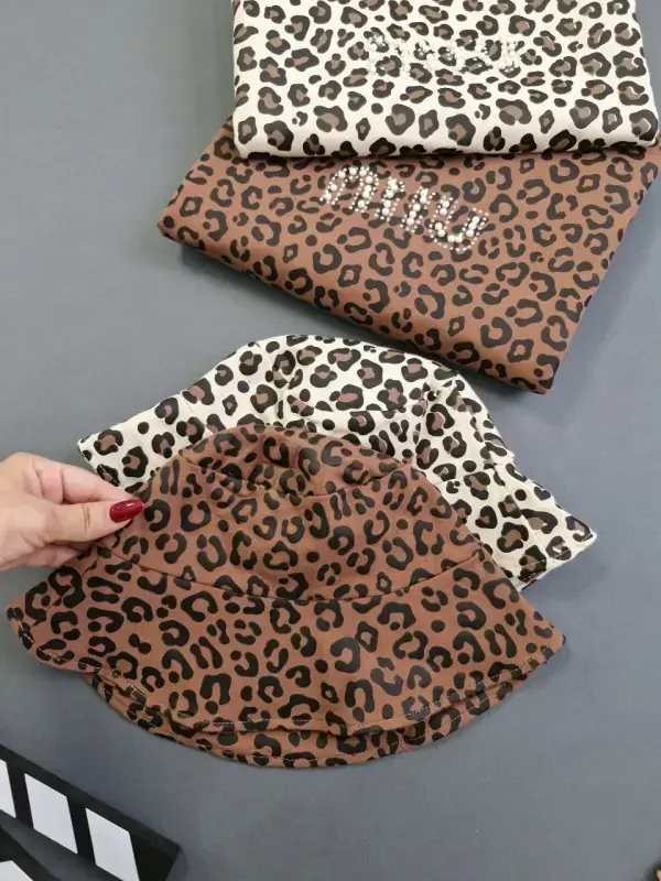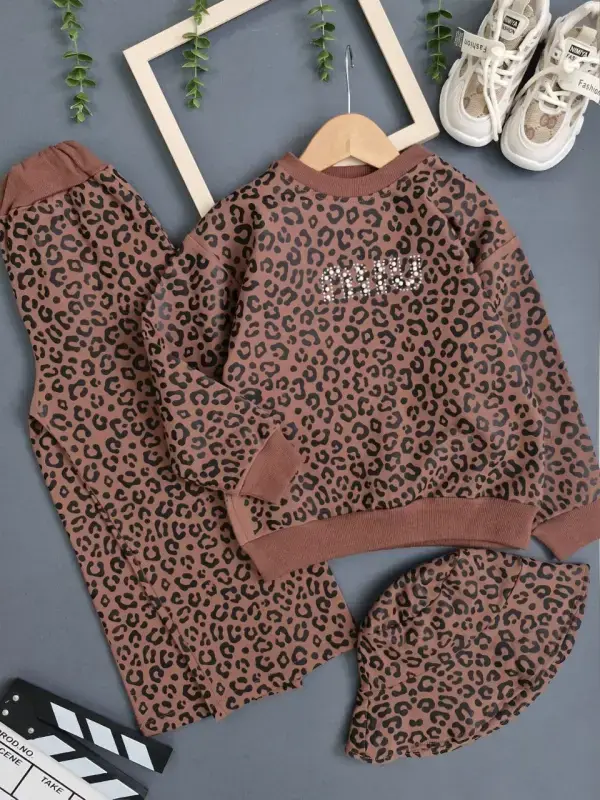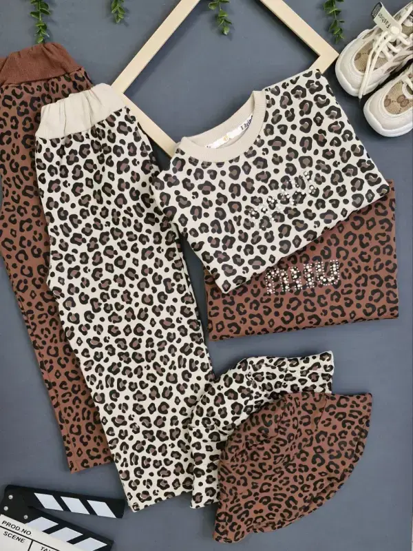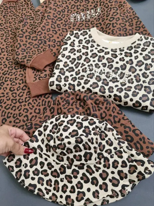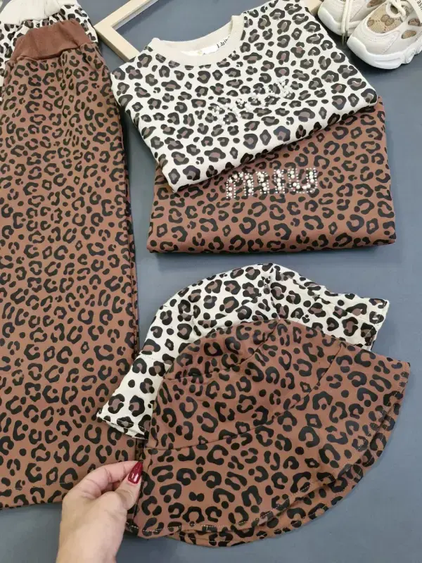 خرید عمده ست سه تکه پلنگی دخترانه شامل بلوز، شلوار و کلاه