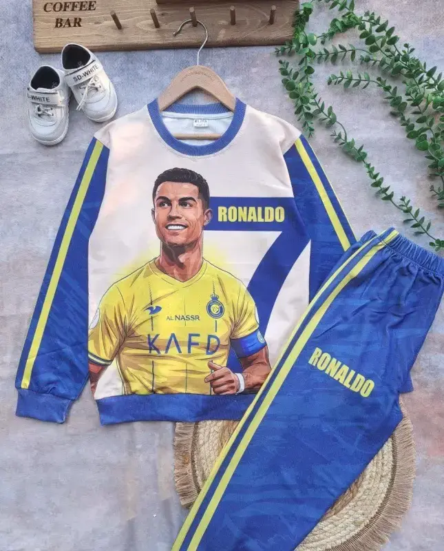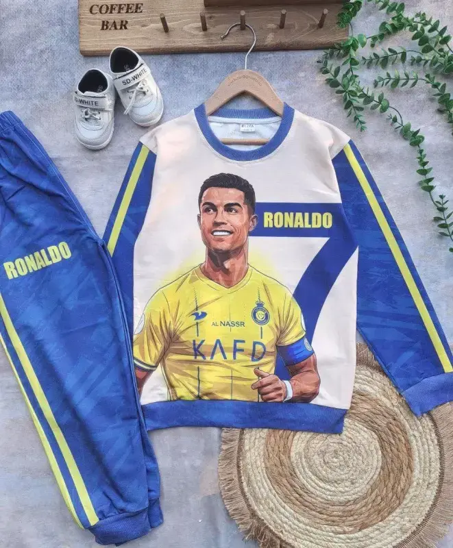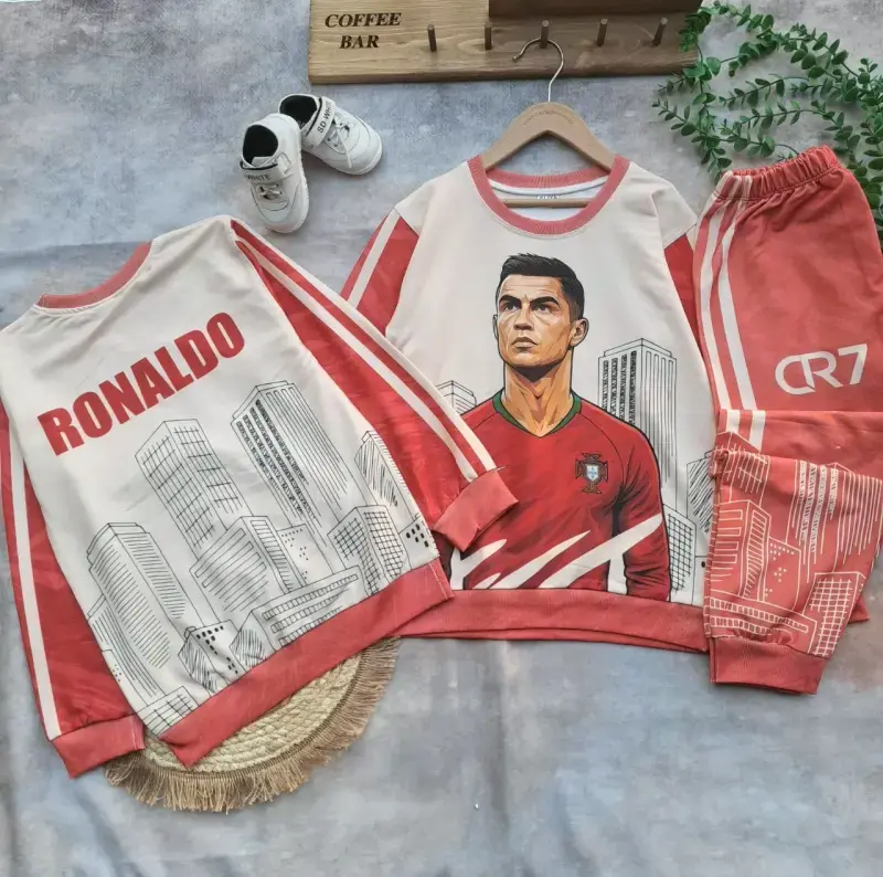 ارائه دهنده ست بلوز شلوار پسرانه با طرح جذاب رونالدو CR7، مناسب برای فروشگاهها و بوتیکهای پوشاک.