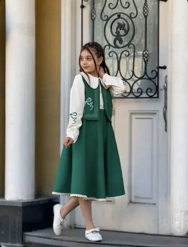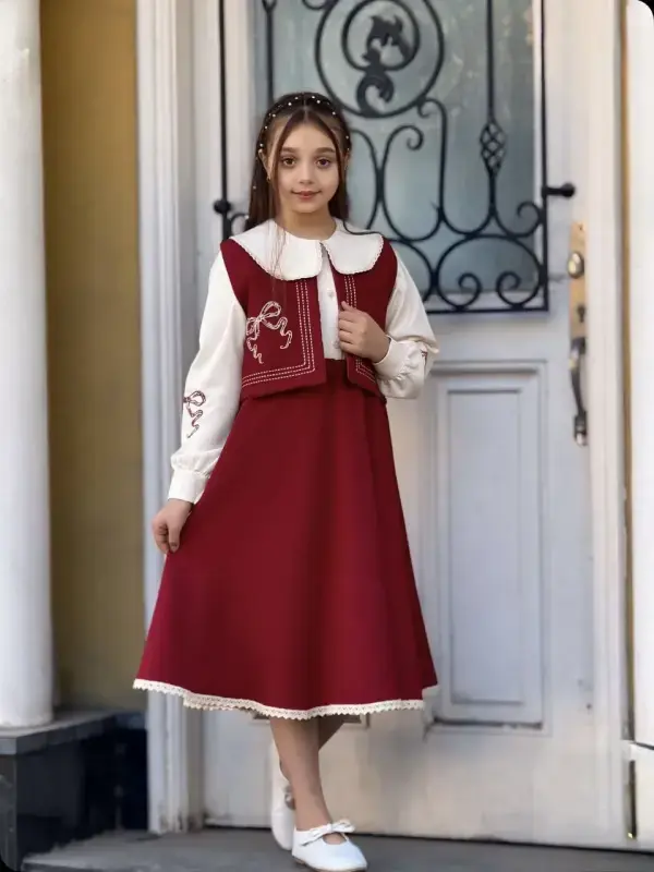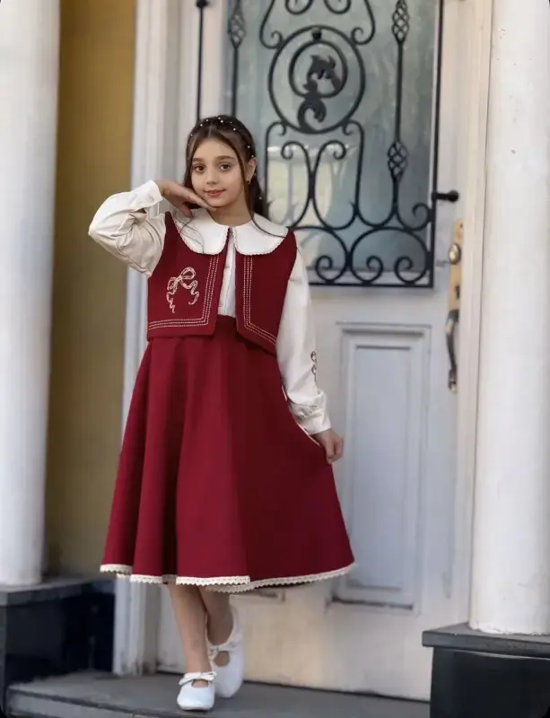 خرید عمده ست سه تیکه دخترانه یلدایی مدل جلیقه، دامن و شومیز برای سنین 8 تا 14 سال