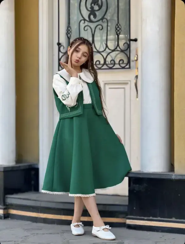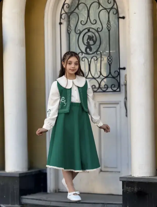 ست سه تیکه دخترانه یلدایی مدل جلیقه، دامن و شومیز