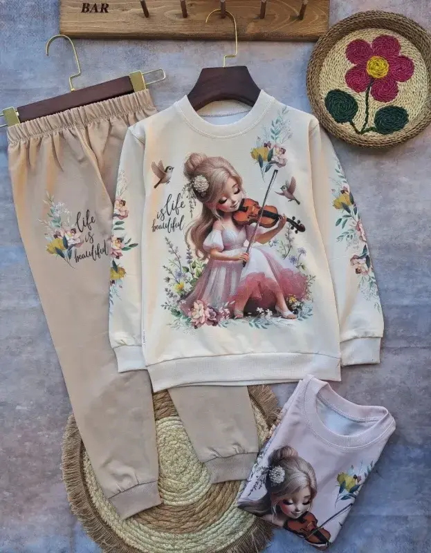 ارائه شده در کالکشن جدید، بلوز شلوار دخترانه با طرح جذاب ویولن و گل، گزینهای ایدهآل برای خرید عمده پوشاک دخترانه است.