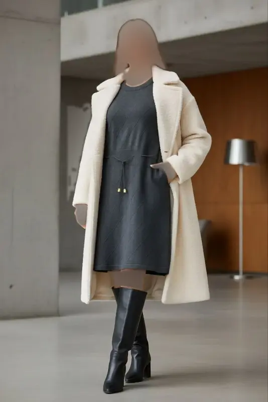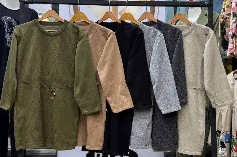 خرید عمده مانتو بافت زنانه یقه گرد کمربند دار طرح لوزی کالکشن پاییزه