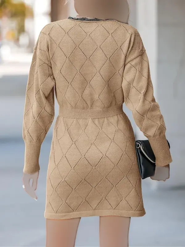 مانتو بافت زنانه یقه گرد کمربند دار طرح لوزی - کالکشن پاییزه