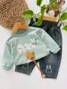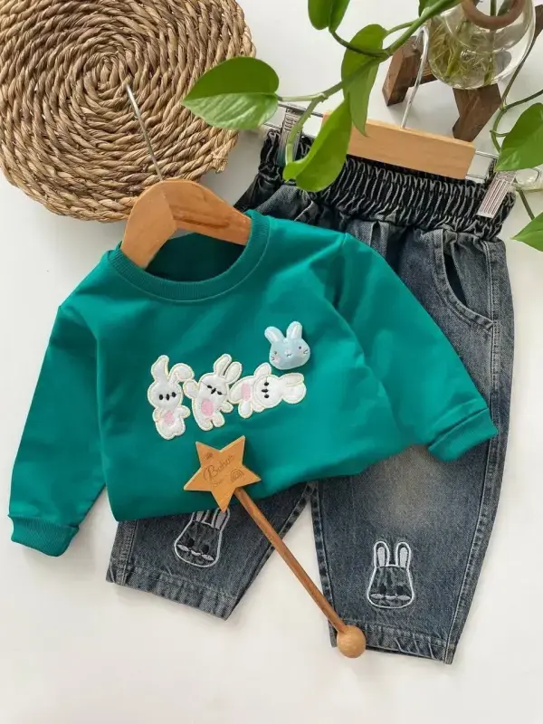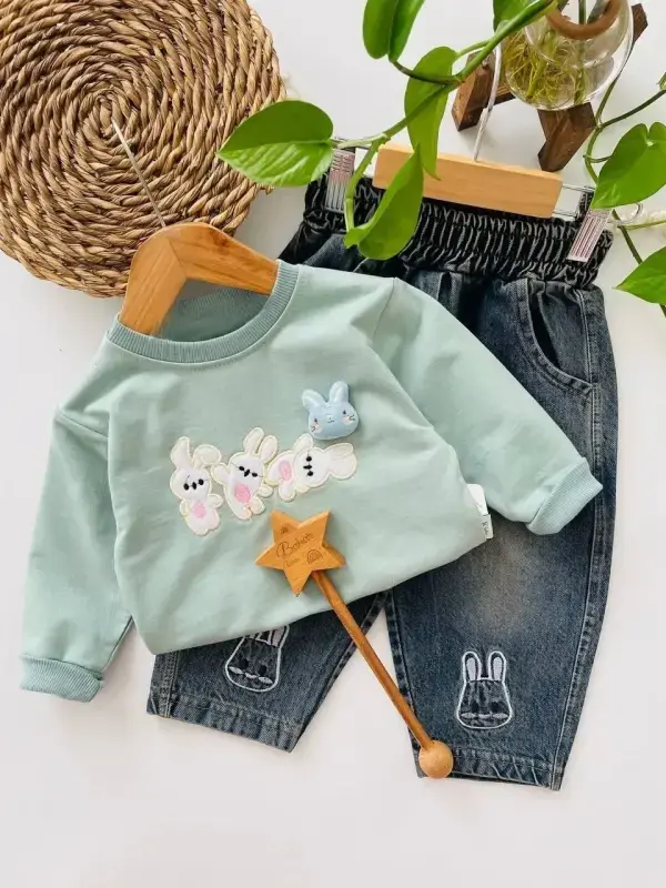 این محصول شامل ست بلوز و شلوار بچگانه با طرح جذاب خرگوش است که برای خرید عمده پوشاک بچگانه گزینهای ایدهآل محسوب میشود.