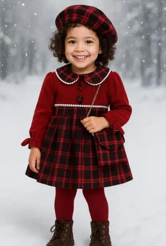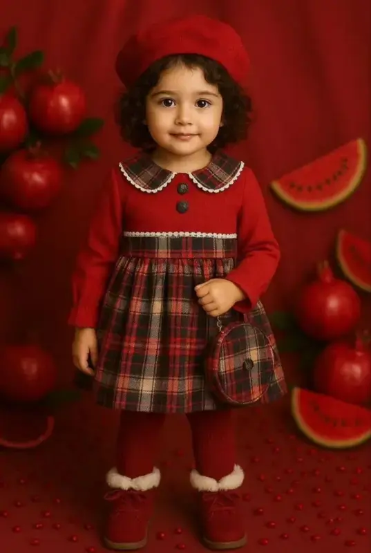 ارائه شده در یک ست کامل شامل سارافون، کلاه و کیف با طرح جذاب چهارخانه، این مجموعه انتخابی ایدهآل برای تکمیل استایل دختران شماست.