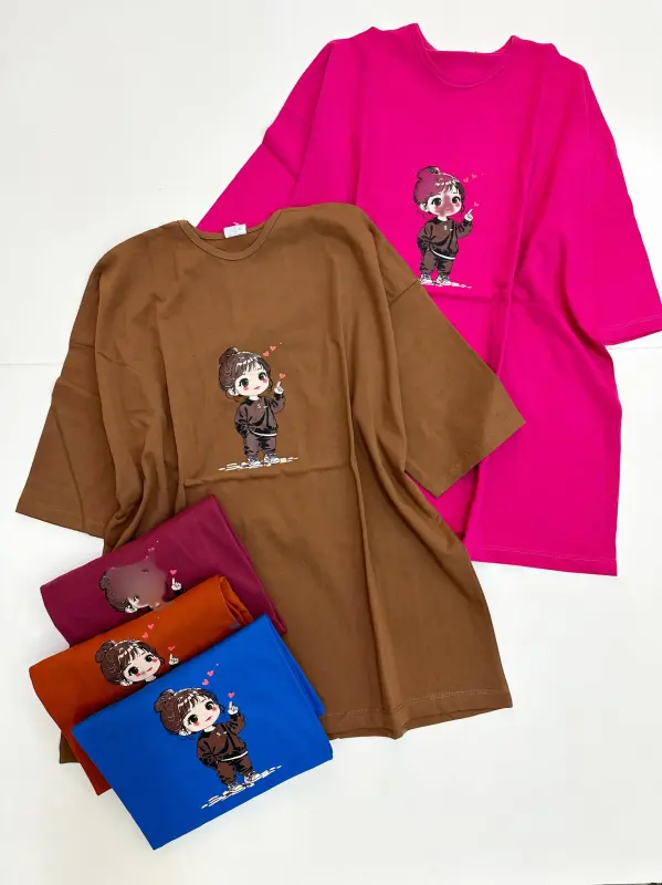 خرید عمده تیشرت لانگ قواره رستمی طرح دختر کارتونی، جنس پنبه سوپر، سایزبندی 44 تا 56، در 10 رنگ جذاب
