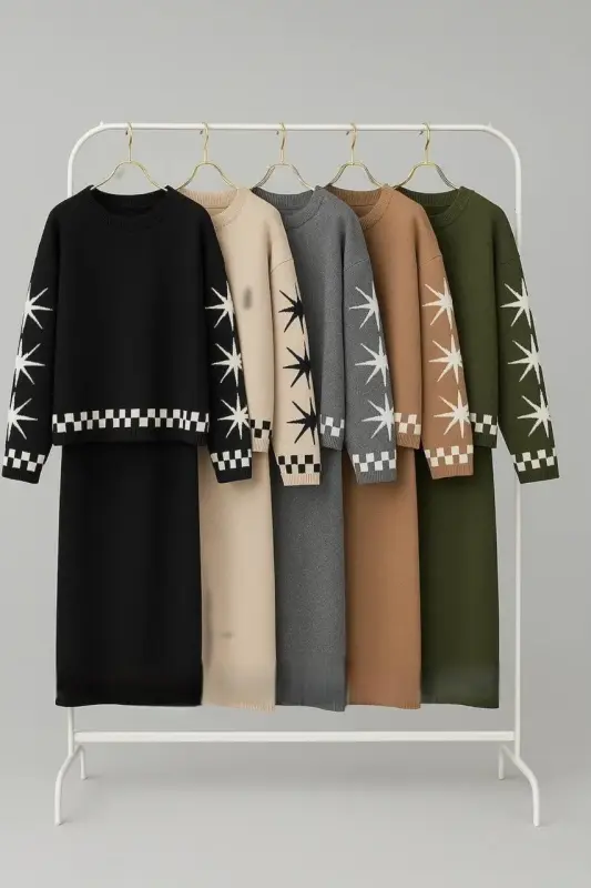 این ست بافتنی زنانه شامل یک بلوز و یک دامن با طرحهای جذاب ستاره و شطرنجی است. این محصول با کیفیت بالا و طراحی منحصر به فرد، انتخابی ایدهآل برای تکمیل استایل شماست.