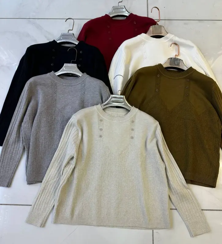 خرید عمده بافت یقه گرد زنانه طرح کبریتی با دکمه تزئینی