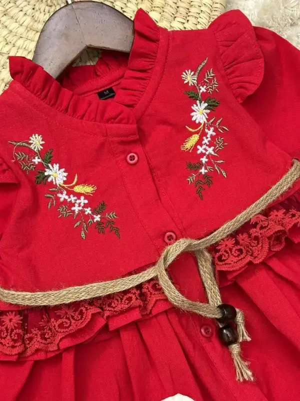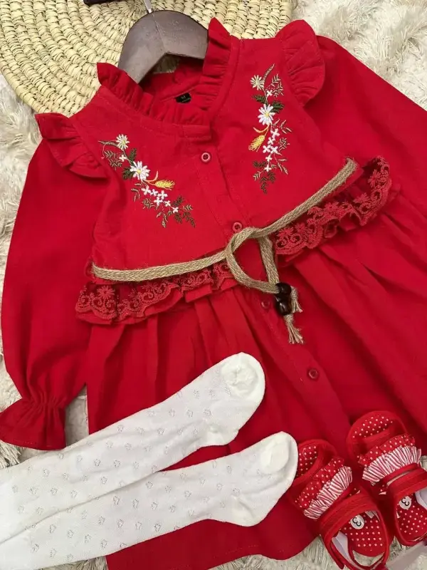 پیراهن دخترانه نخی گلدوزی شده با کمربند کنفی