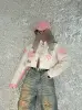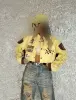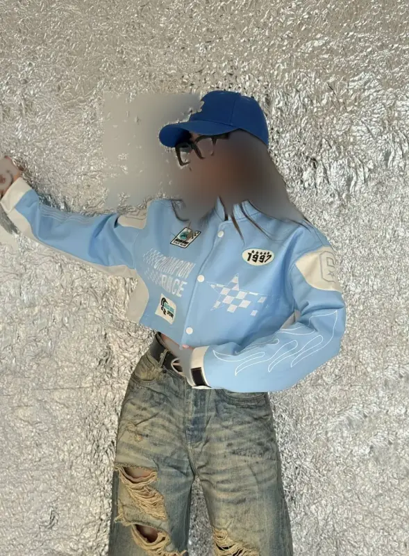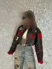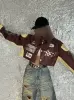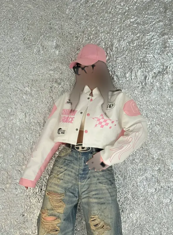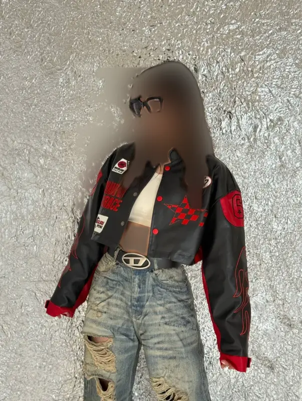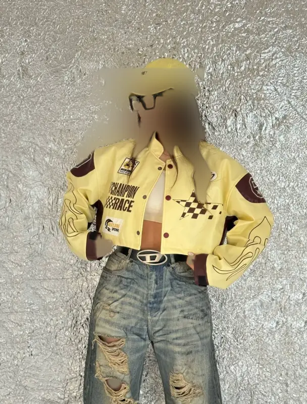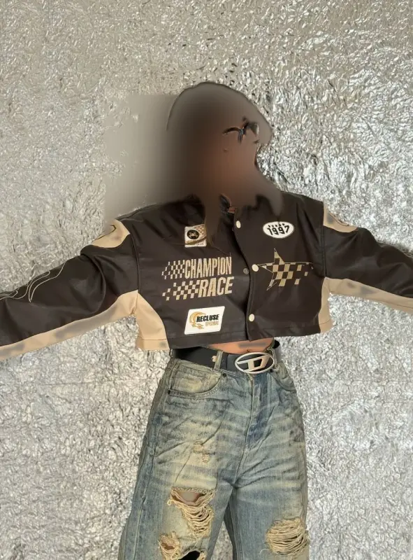 خرید عمده کاپشن کراپ چرم زنانه طرح مسابقه ای race69