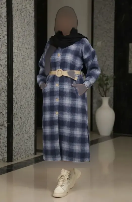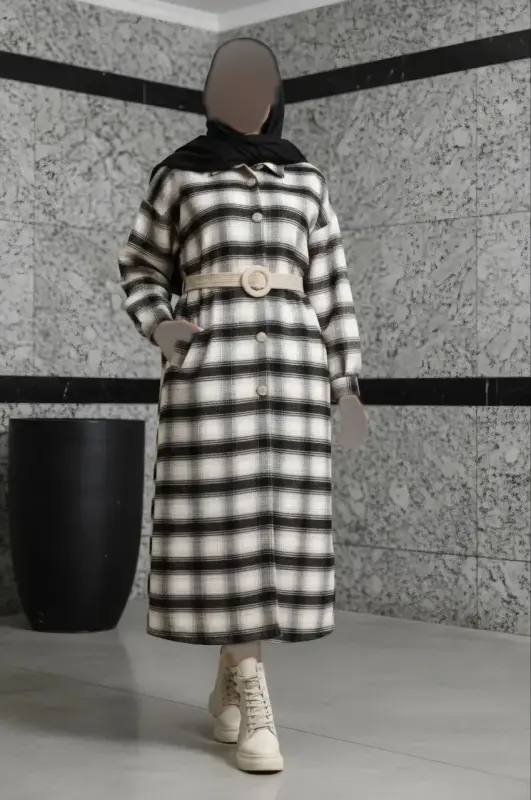 پالتو پشمی زنانه دو جیب کمربند کنفی طرح چهارخانه