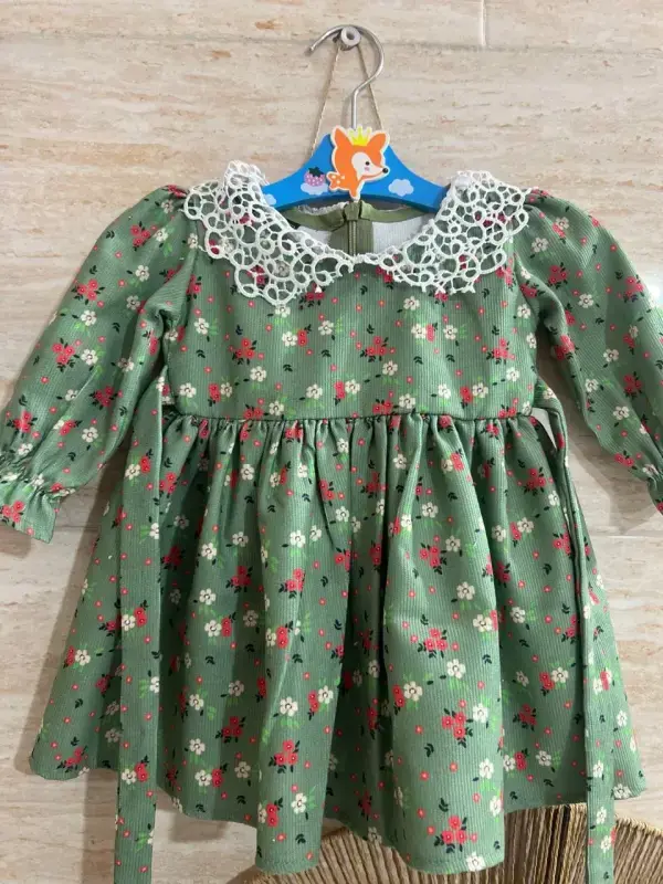 پیراهن دخترانه گلدار سبز یقه گیپور
