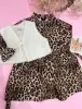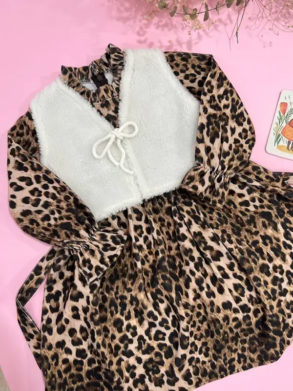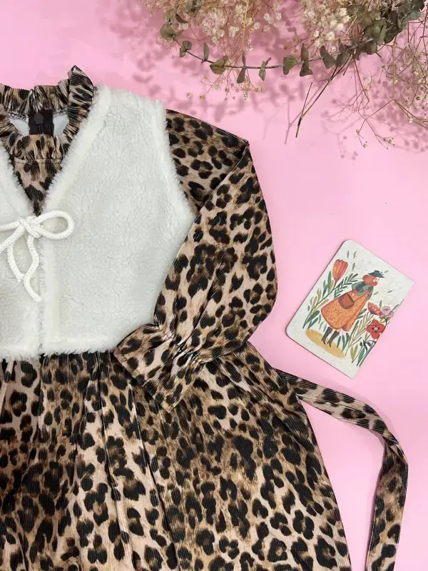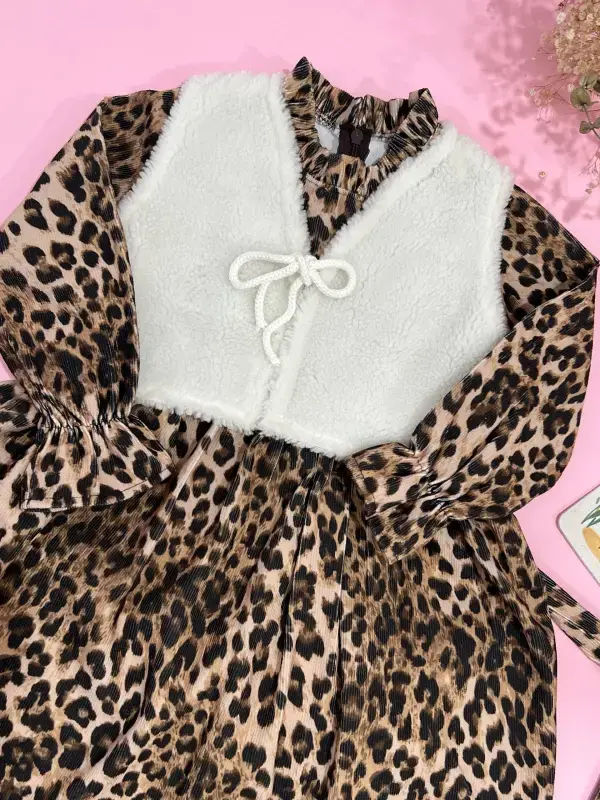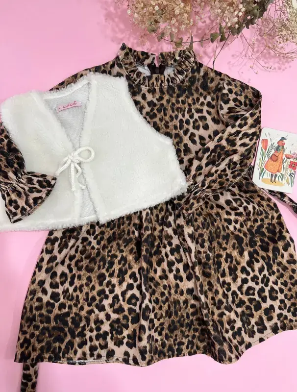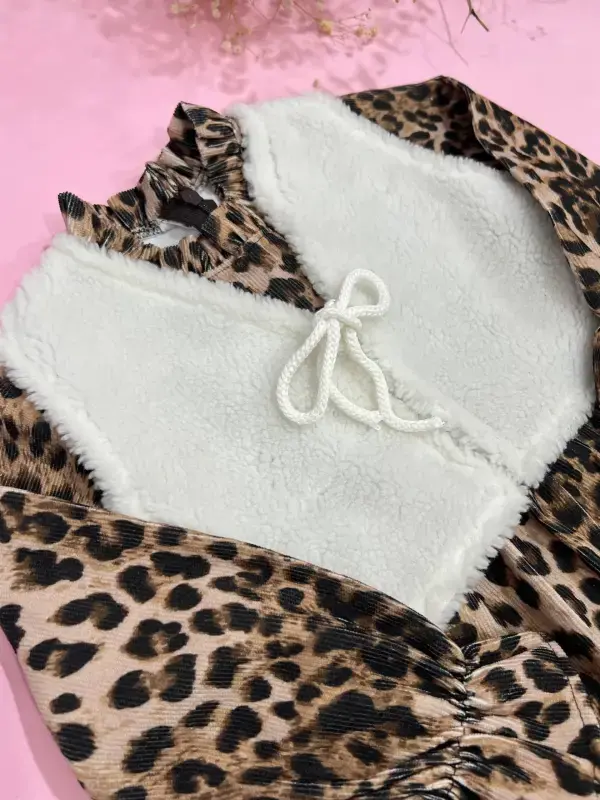 این ست شامل یک پیراهن کبریتی با طرح پلنگی جذاب و یک جلیقه تدی گرم و نرم است که انتخابی ایدهآل برای استایل زمستانی کودکان محسوب میشود.