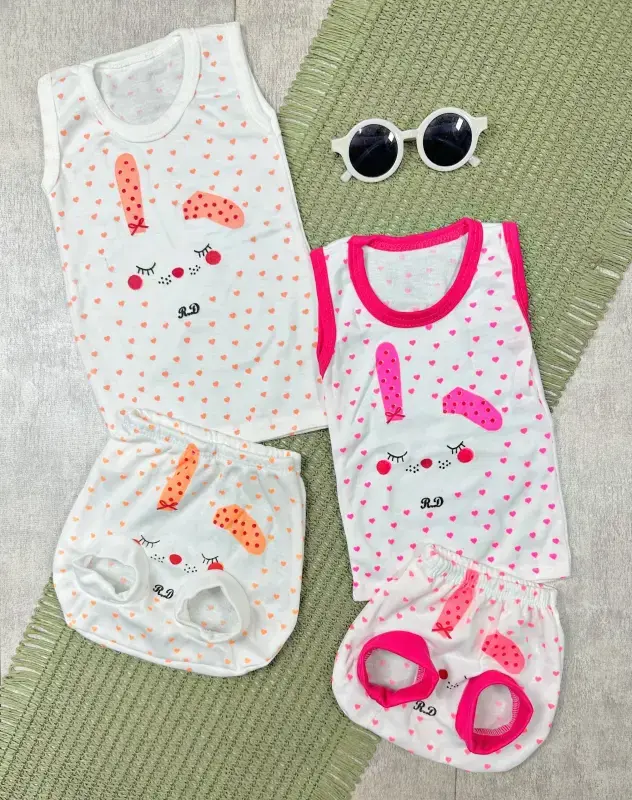 ارائه دهنده خرید عمده پوشاک بچه گانه، ست رکابی و شورت عینکی نوزادی با طرح جذاب خرگوش قلب. این ست برای نوزادان طراحی شده و انتخابی مناسب برای تکمیل کمد لباس فروشگاه شماست.