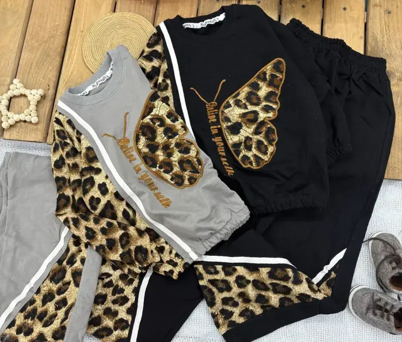 خرید عمده بلوز شلوار دخترانه طرح پلنگی با طرح پروانه و متن believe in yourself