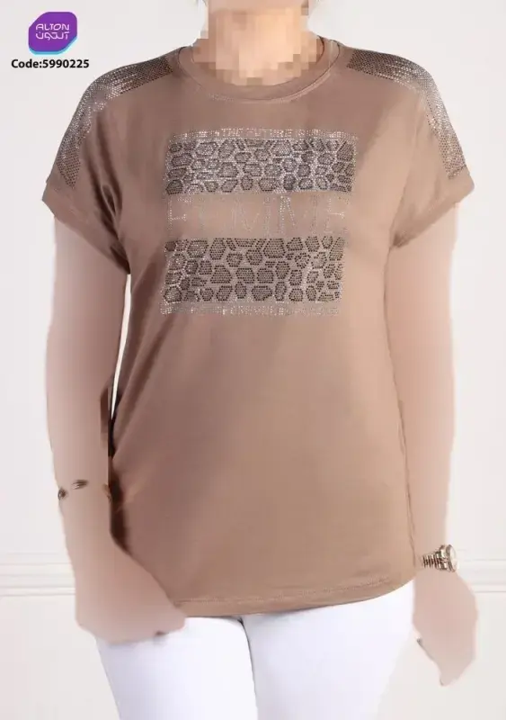 خرید عمده تیشرت زنانه طرح کیمونو یقه گرد با نگین و طرح پلنگی