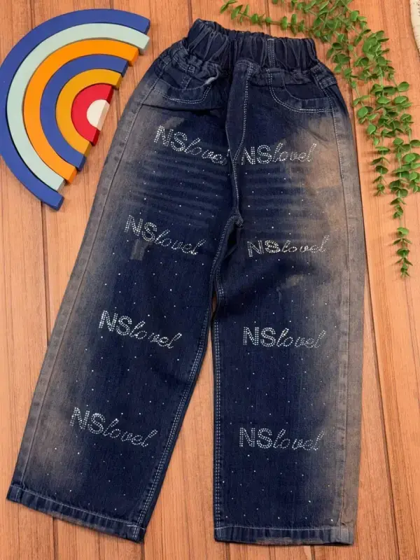 شلوار لی بگ نگینی آبی نفتی دخترانه کد 6672