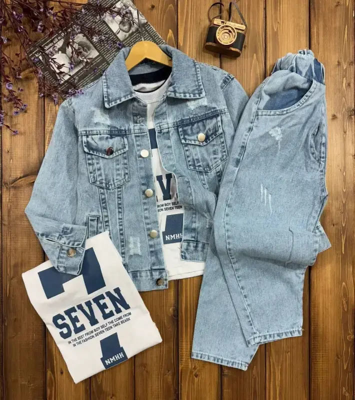 خرید عمده ست کت و شلوار لی پسرانه گرم بالا با تیشرت طرح دار