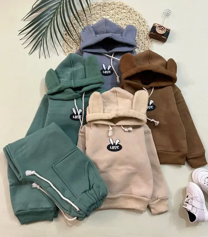 خرید عمده ست هودی و شلوار دخترانه و پسرانه طرح لاو با گوش خرگوشی