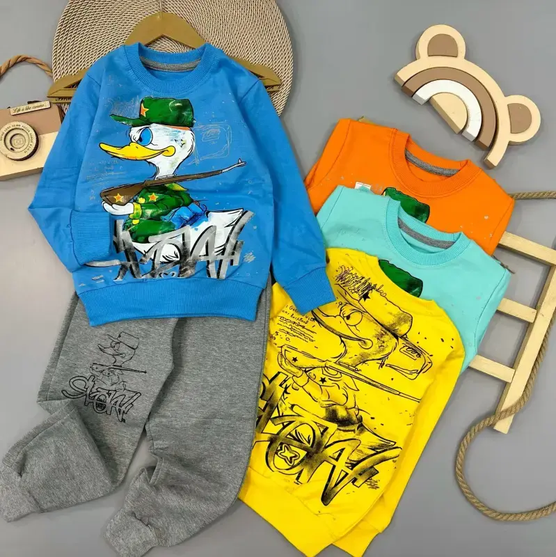 خرید عمده بلوز شلوار پسرانه طرح اردک سرباز چاپ ثابت ملانژ و پنبه دورو اعلا