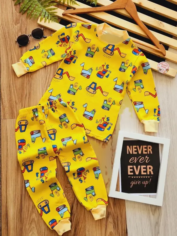 ست بلوز شلوار طرح ماشین آلات راهسازی در رنگبندیهای متنوع و طرحهای گوناگون موجود است.