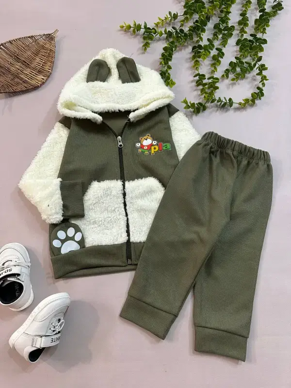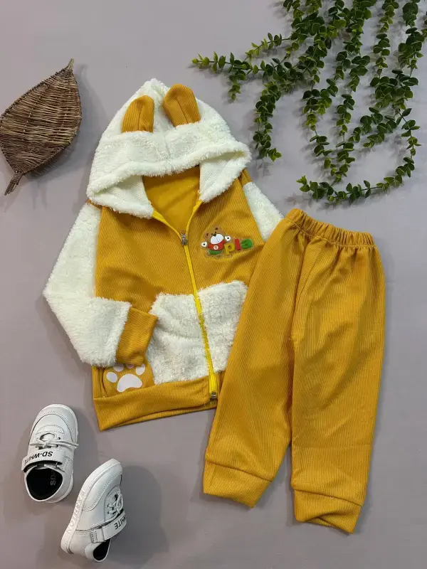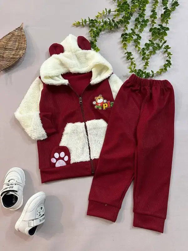 ست سویشرت و شلوار بره ای کبریتی بچگانه با طرح خرس