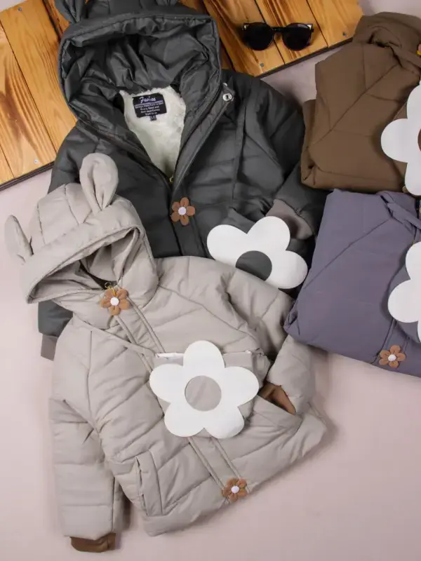 خرید عمده کاپشن دخترانه طرح گل و پاپیون با کلاه خزدار