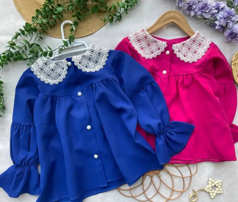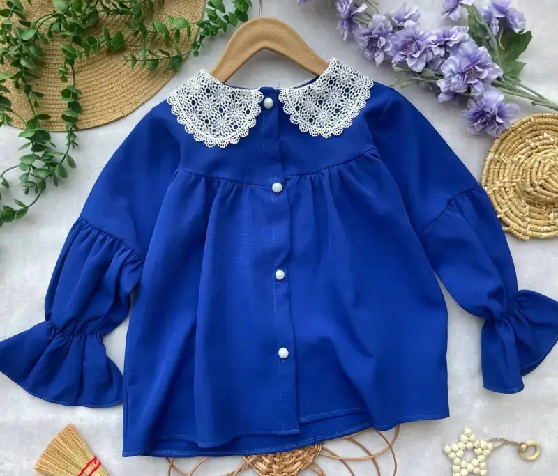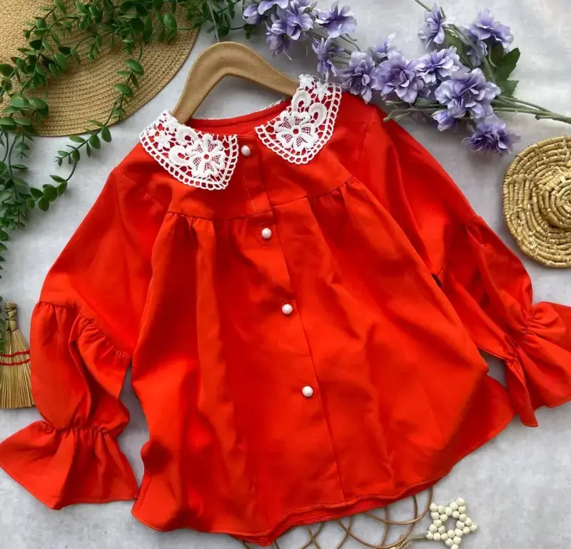این شومیز دخترانه با یقه گیپور طرحدار، انتخابی شیک و جذاب برای کودکان 4 تا 10 سال است.