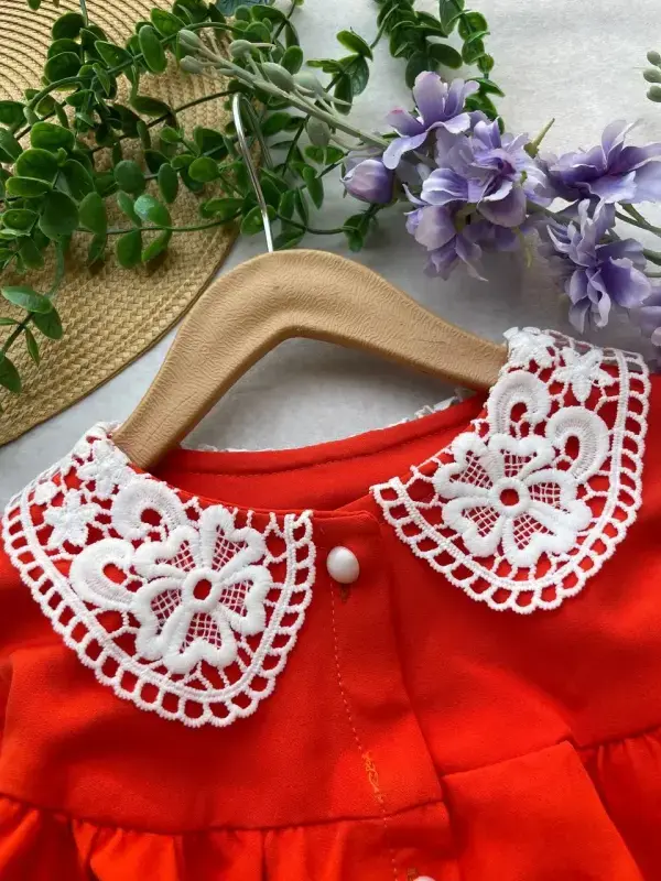 - طراحی یقه: یقه گیپور طرحدار که جلوهای خاص و دخترانه به لباس میبخشد.