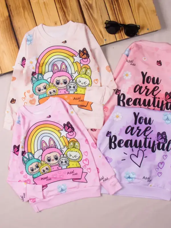 خرید عمده بلوز دخترانه طرح رنگین کمان و خرگوش فینگردار