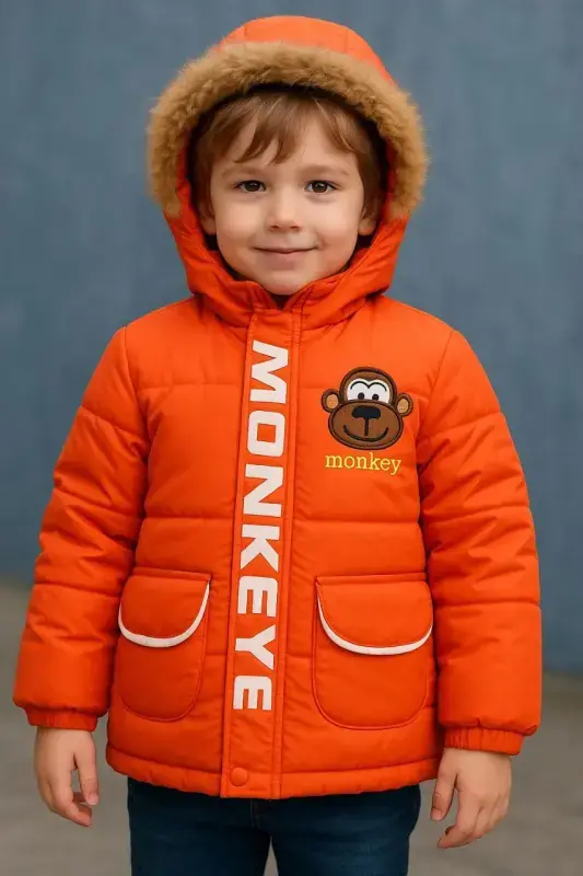 خرید عمده کاپشن پسرانه نارنجی طرح میمون با آستر خز و کلاه خزدار