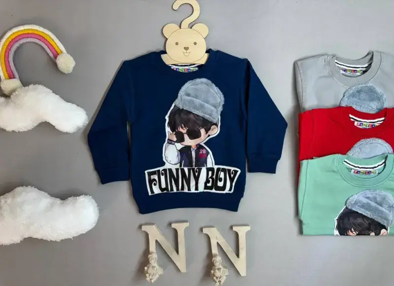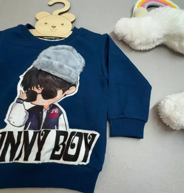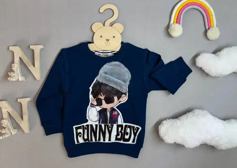 خرید عمده بلوز تک پسرانه طرح "فانی بوی" با عینک آفتابی