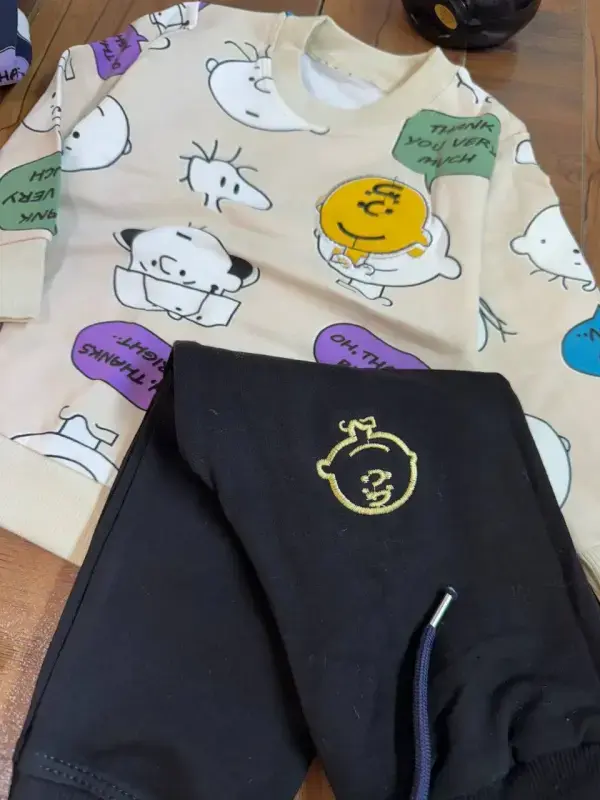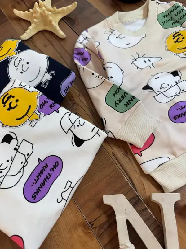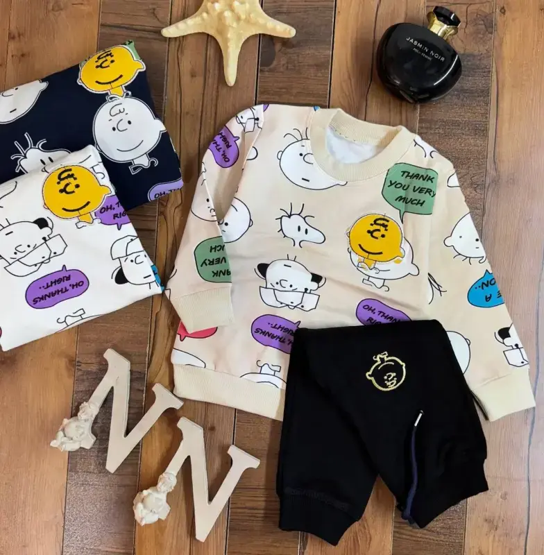 معرفی ست بلوز شلوار پسرانه با طرح محبوب اسنوپی، انتخابی ایدهآل برای تکمیل ویترین فروشگاه شما. این محصول با ترکیب رنگهای سفید، مشکی و کرم، جذابیت بصری بالایی دارد و مورد پسند کودکان قرار میگیرد.