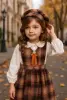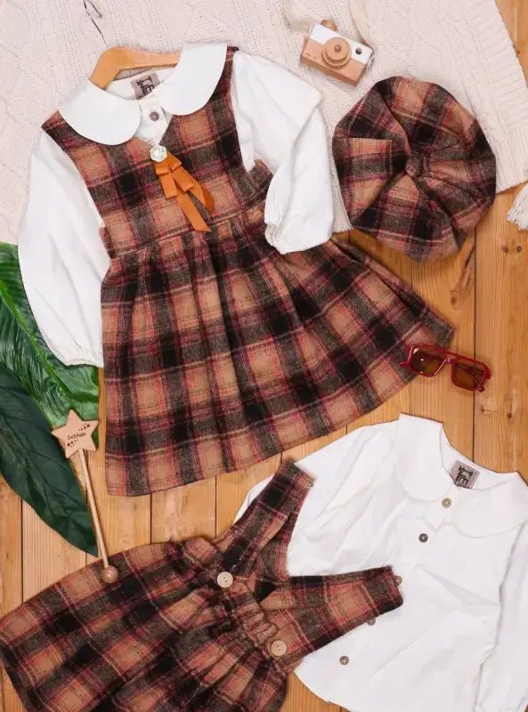 خرید عمده ست سه تیکه پاییزه دخترانه شامل شومیز، سارافون و کلاه طرح چهارخانه