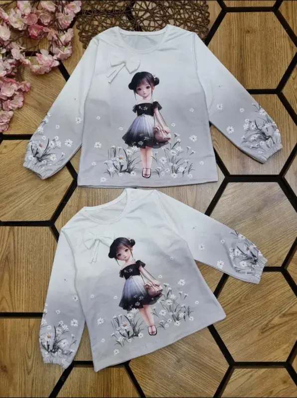 خرید عمده بلوز دخترانه طرح نقاشی فانتزی با پاپیون و گلهای بابونه