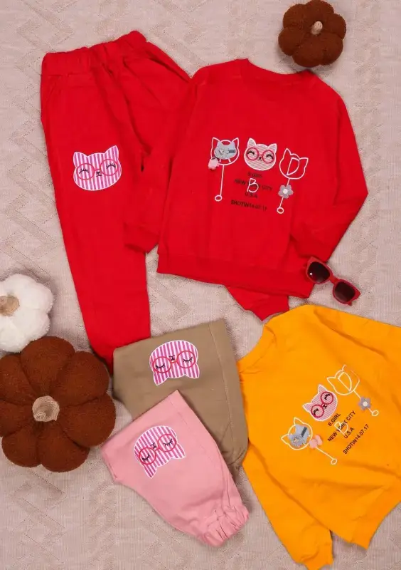 خرید عمده بلوز شلوار دخترانه طرح گربه پنبه‌ای