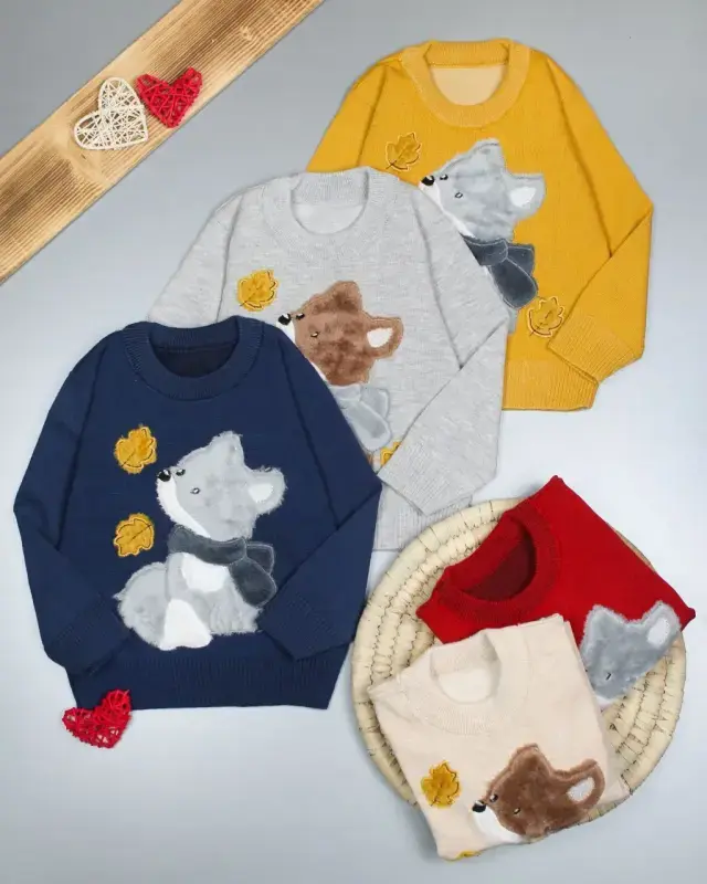 خرید عمده پلیور بافتنی پاییزه دخترانه طرح روباه و خرس با گلدوزی