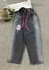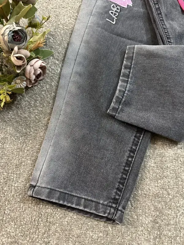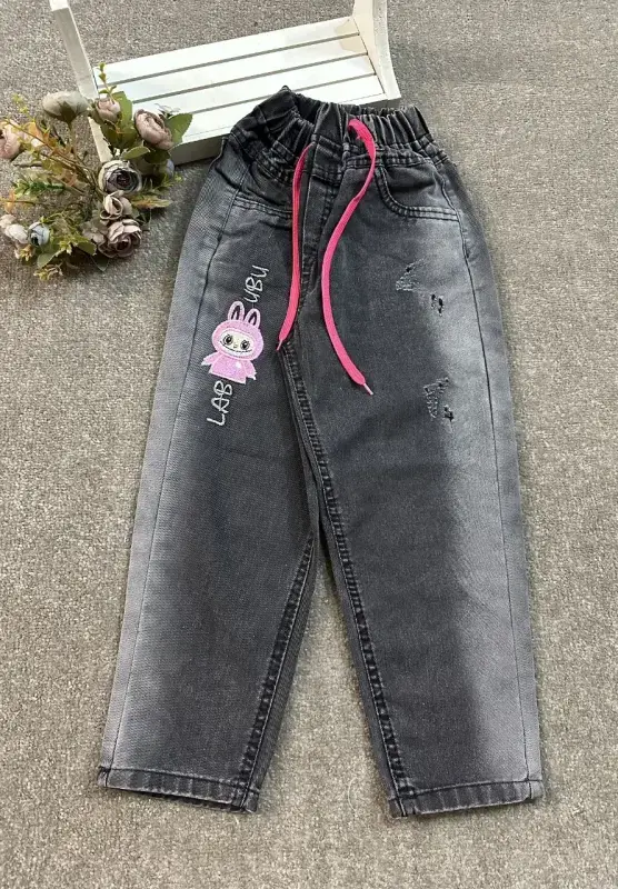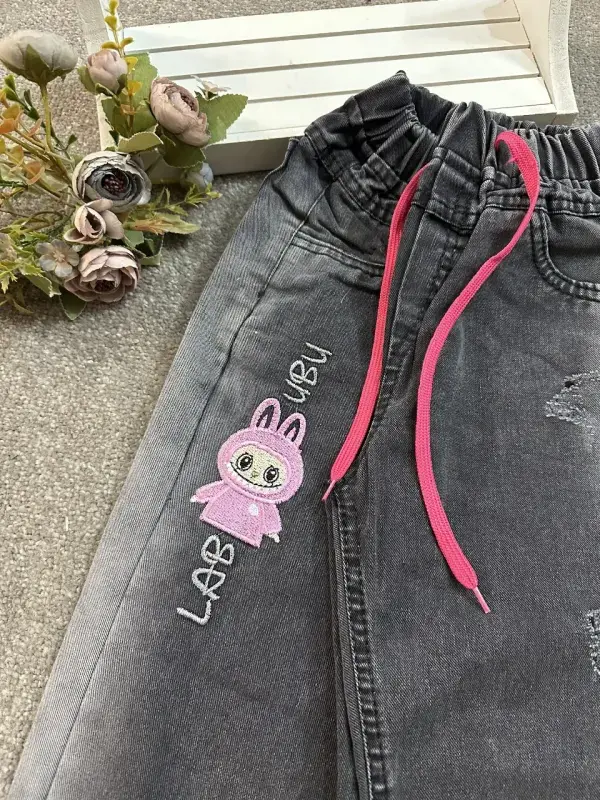 خرید عمده شلوار لی ذغالی دخترانه گلدوزی شده طرح لبوبو