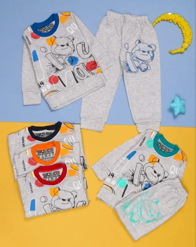 معرفی ست بلوز شلوار پسرانه با طرح جذاب خرس و حروف که به صورت تمام چاپ ارائه شده است. این ست با پارچه مرغوب ملانژ لاکرادار، انتخابی ایدهآل برای عرضه در بوتیکها و فروشگاههای پوشاک است.