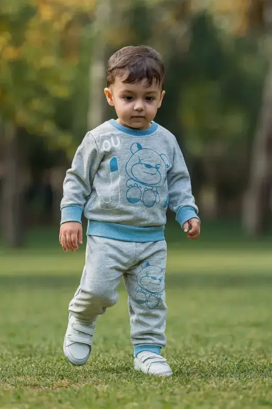 بلوز شلوار پسرانه طرح خرس تمام چاپ ملانژ لاکرادار