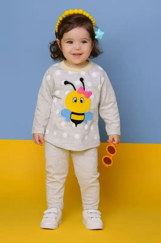 ارائه دهنده خرید عمده پوشاک کودک، بلوز شلوار دخترانه با طرح جذاب زنبور نگینی. این محصول با پارچه ملانژ لاکرادار، راحتی و دوام را برای کودکان فراهم میکند.