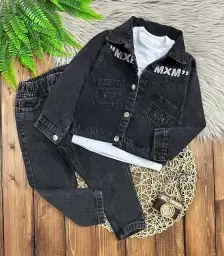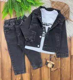 ست سه تیکه زغالی پسرانه شامل شلوار جین، بلوز و کاپشن