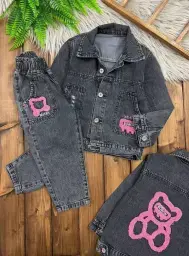 ست کت و شلوار جین دخترانه طرح خرس صورتی
