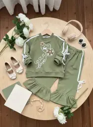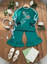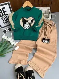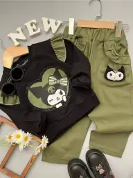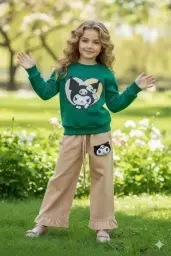 بلوز شلوار دخترانه طرح کیتی سبز و کرم
