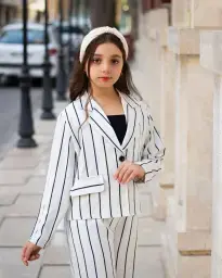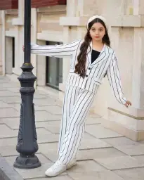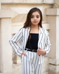 ست کت و شلوار کرپ دخترانه طرح راه راه به همراه تاپ و کمربند